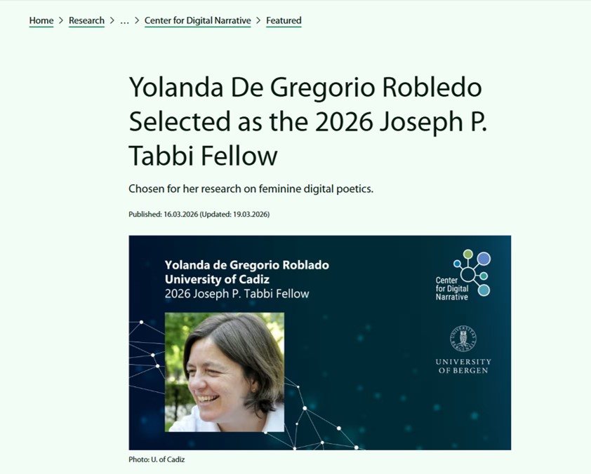 Su proyecto, centrado en el estudio de la literatura digital femenina ha sido destacado por su excelencia y adecuación a las actividades y recursos de l CDN (Center of digital Narrative. U. Bergen)