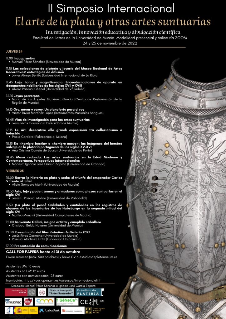 Se ha anunciado la convocatoria del II Simposio Internacional El Arte de la Plata y otras Artes Suntuarias, que se celebrará en la Universidad de Murcia (España) los días 24 y 25 de noviembre de este año. La temática del simposio estará relacionada con cualquier campo de investigación dentro de las artes decorativas y suntuarias (platería, joyería, orfebrería, textiles, mobiliario, bronces, trabajos en hierro…) en cualquier época y lugar.